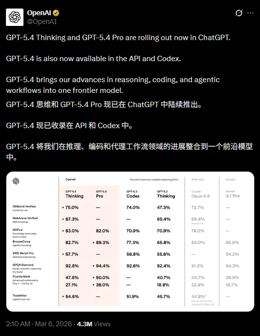 GPT-5.4 深夜上线!百万上下文+原生操作电脑,OpenClaw 天选模型来了!【附GPT升级教程】