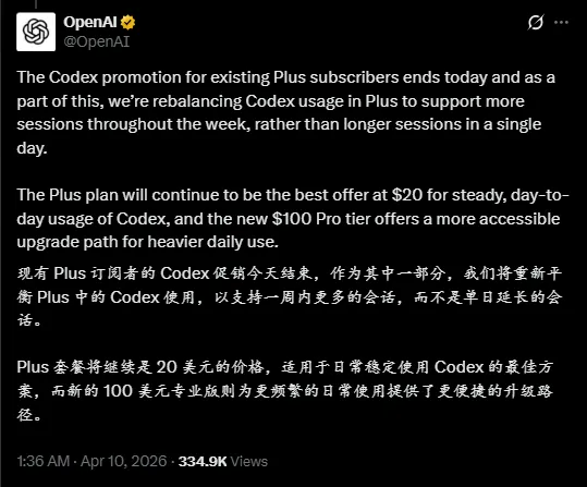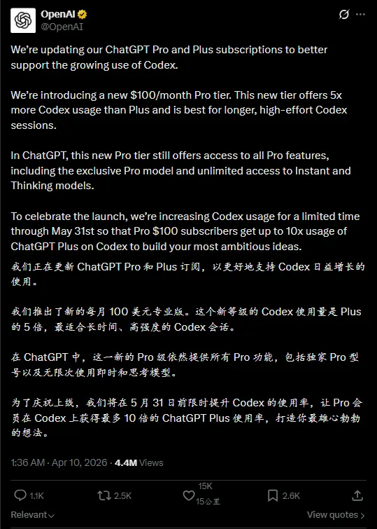 再结合 OpenAI 此前给出的承诺:在 5 月 31 日之前,新推出的 100 美元 Pro 订阅,其 Codex 额度将达到 Plus 的 10 倍。这样看下来,这更像是一种“过渡式”的分层策略。